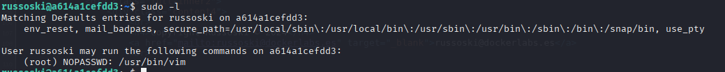 para observar si tenemos permisos para ejecutar sudo de alguna manera. Tenemos acceso a vim sin contraseña.
